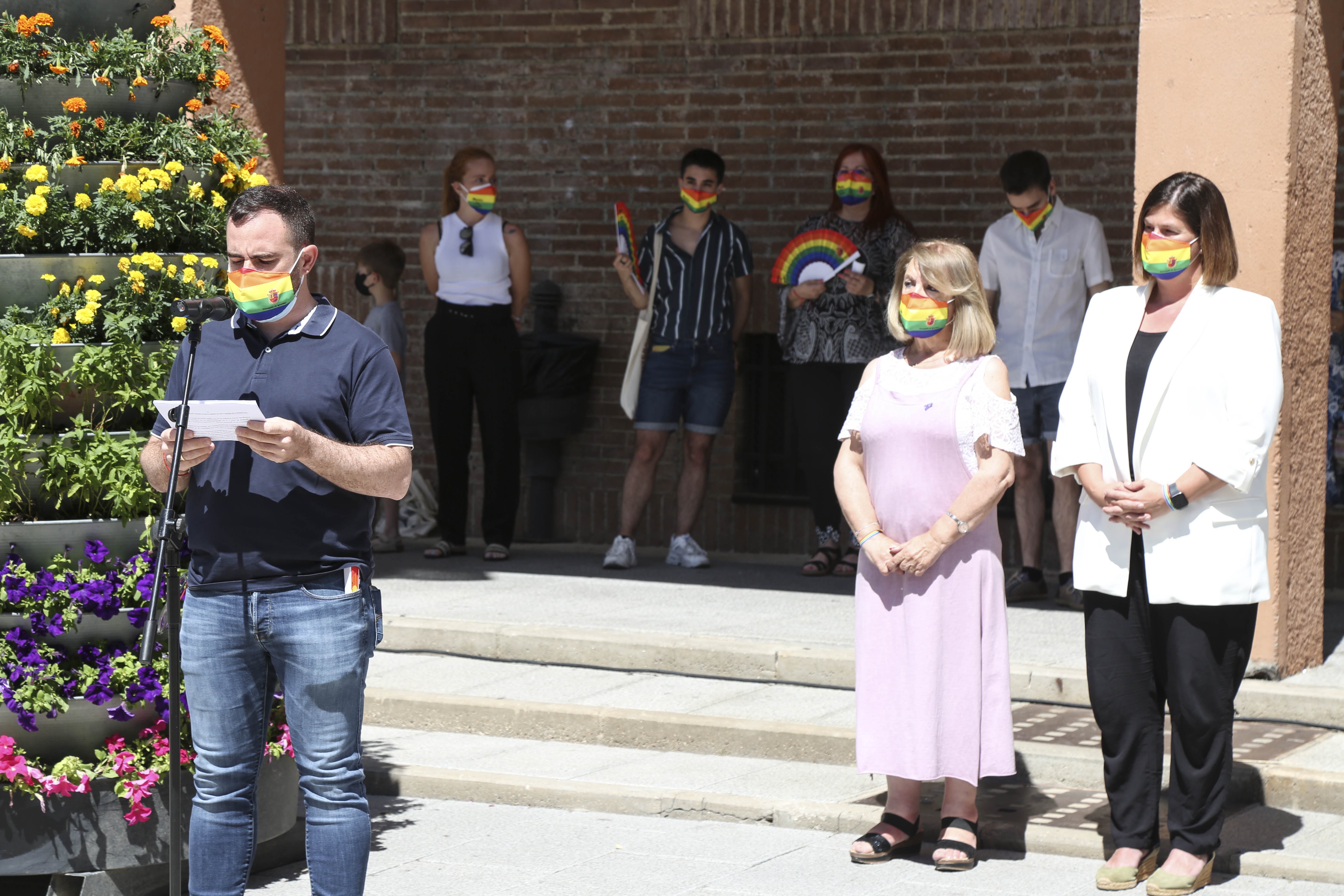 Acompañados de otros miembros de la corporación municipal, en la Plaza de España se ha procedido a la lectura del Manifiesto en defensa de los derechos de las personas LGTBI por parte de y la Asociación LGTBI Arcópoli, la Federación de Comerciantes, ACEPA, Asociación Democrática de Mujeres, y Sinergias.