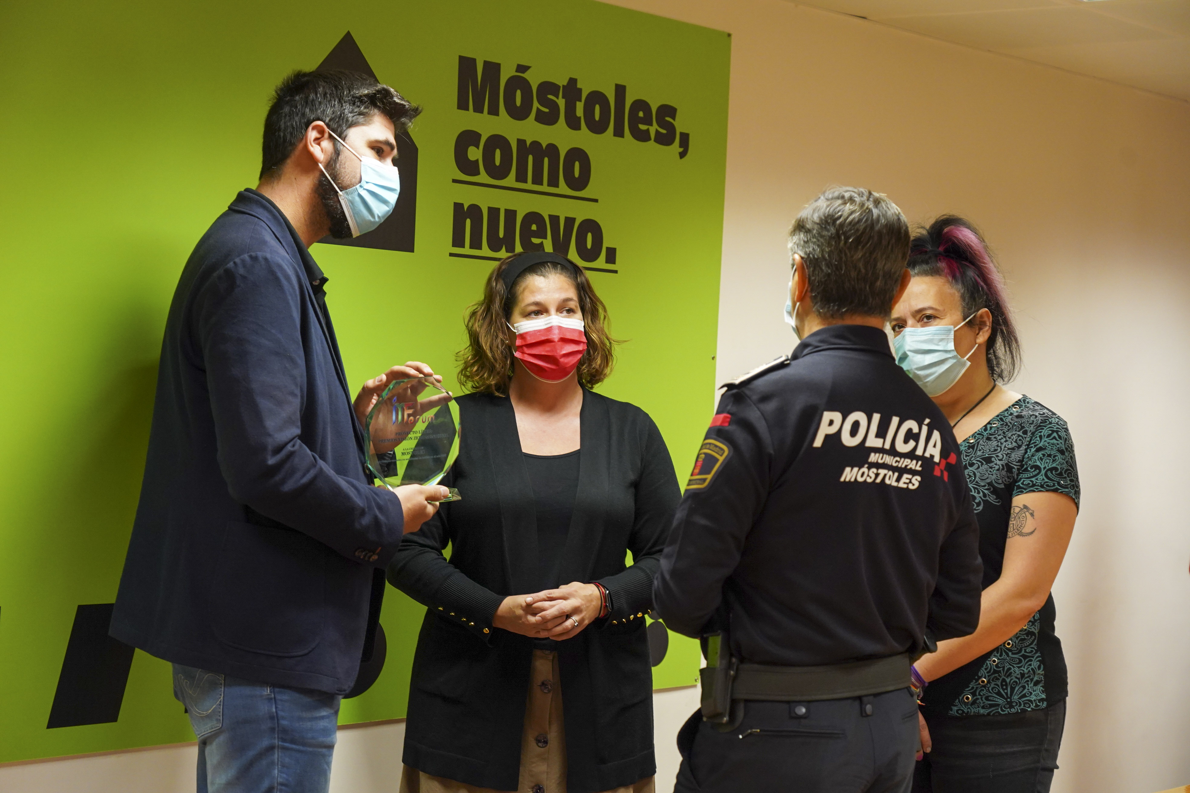 La Alcaldesa Noelia Posse, el Concejal de Seguridad, Alex Martín, y el Jefe de Policía Municipal de Móstoles, Juan Manuel Arribas, y la Portavoz de Podemos, Mónica Monterreal, han mostrado hoy el galardón que reconoce la labor del Gobierno Local para tratar de reducir el número de muertos en accidentes de tráfico y, también, la concienciación de las mostoleñas y mostoleños en el área de seguridad vial.