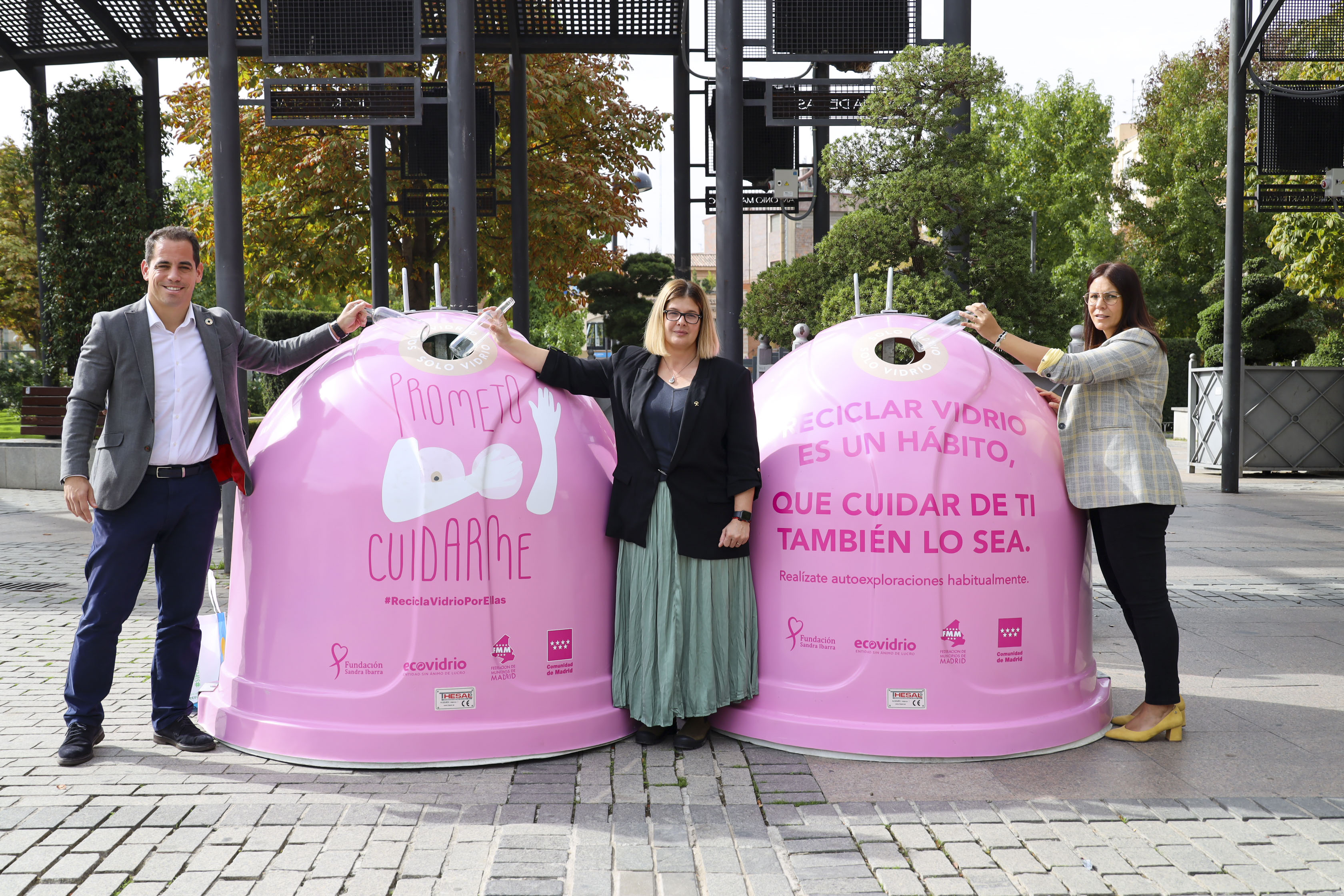 Imagen en alta resolución. Este enlace se abrirá mediante lightbox, puede haber un cambio de contextoLa Alcaldesa, Noelia Posse, acompañada de la Concejala de Empleo y Nuevas Tecnologías, Rebeca Prieto, y el Gerente de Zona de Ecovidrio, Ricardo Sevilla, ha presentado hoy la campaña "Recicla vidrio por ellas" que, por octavo año consecutivo ha puesto en marcha Ecovidrio en colaboración con el Ayuntamiento de Móstoles, con motivo del Día Internacional contra el Cáncer de Mama, que se celebra cada 19 de octubre.