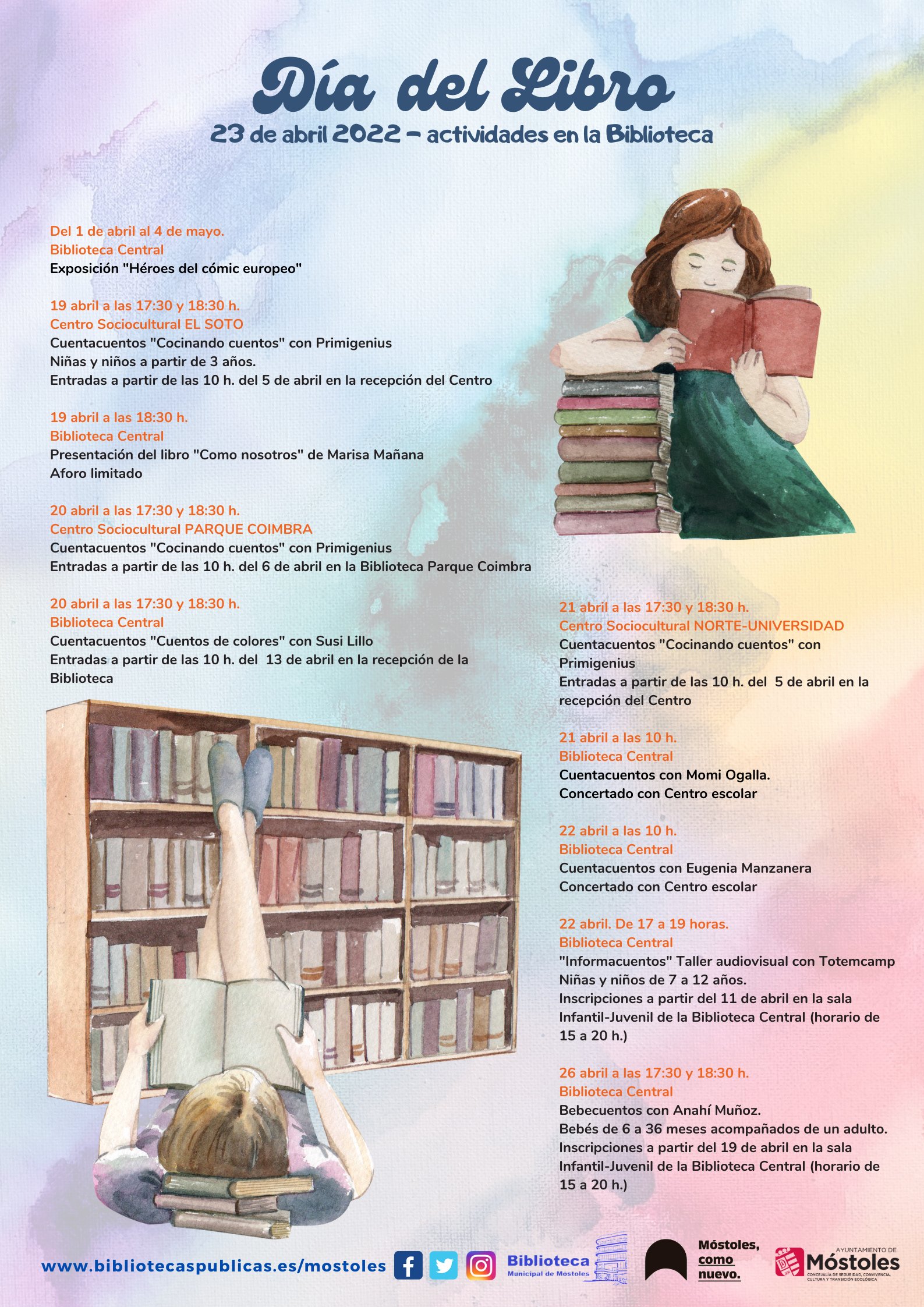 El Gobierno de Móstoles, formado por PSOE y Podemos, ha elaborado una amplia programación destinada a promocionar el libro y la lectura, con motivo del 23 de abril, fecha en la que se conmemora el Día del Libro, que tendrá como acto central la tradicional lectura de ‘El Quijote’ que este año se llevará a cabo en el Centro de Mayores de El Soto el viernes 22 a las 12:00 h.