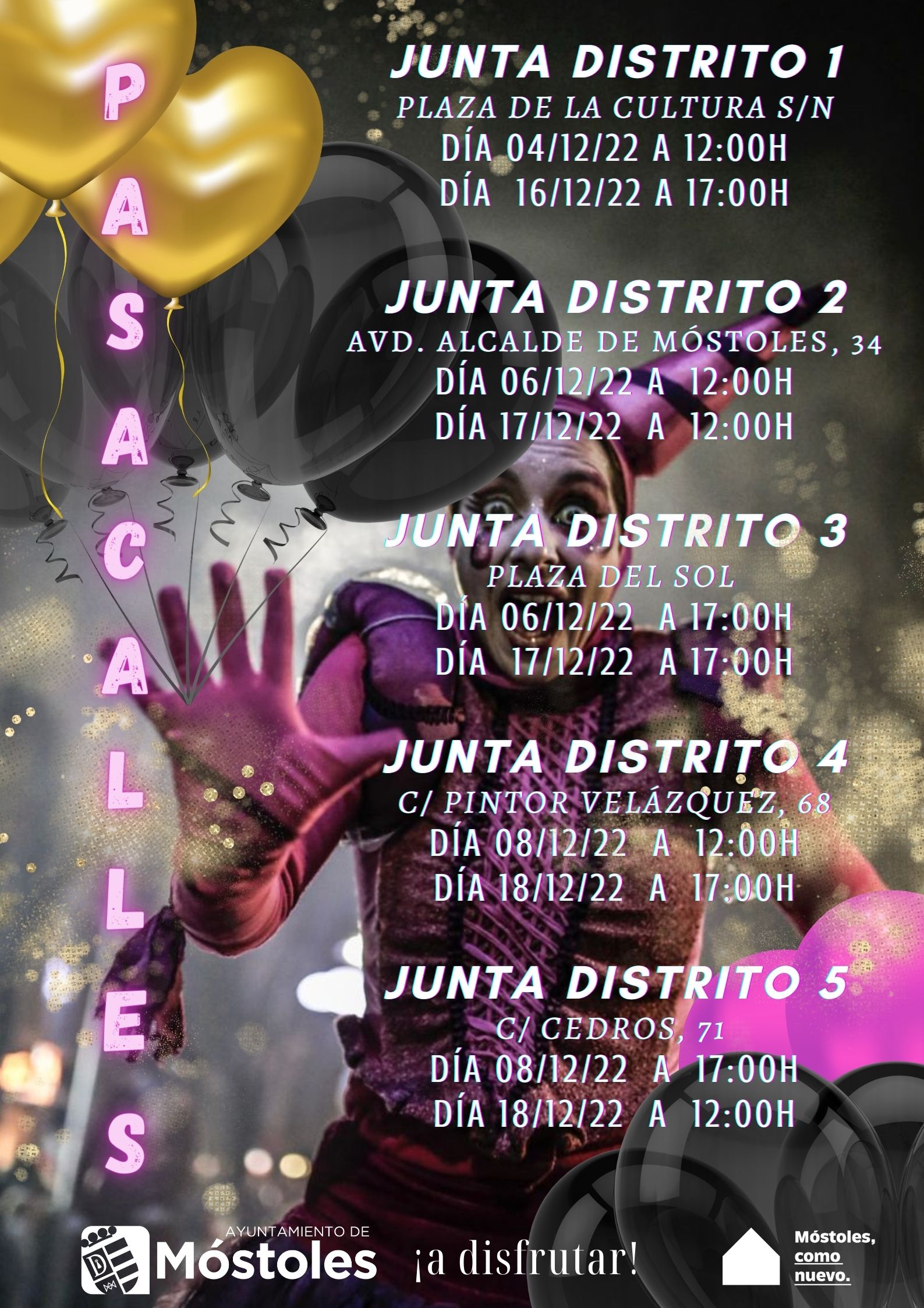 Dentro del programa de fiestas de Navidad, organizado por el Gobierno de Móstoles, formado por PSOE y Podemos, coloridos grupos de animación llevarán a cabo los pasacalles en los cinco distritos del municipio, para hacer partícipes a todos los barrios de la celebración navideña. La iniciativa se amplía este año con la realización de dos pasacalles por distrito.