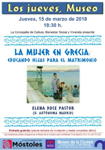 Imagen en alta resolución. Este enlace se abrirá mediante lightbox, puede haber un cambio de contextoEl Museo de la Ciudad acogerá el día 15 de marzo, a las 18.30 horas, la conferencia "La mujer en Grecia: educando hijas para el matrimonio", a cargo de Elena Duce Pastor.