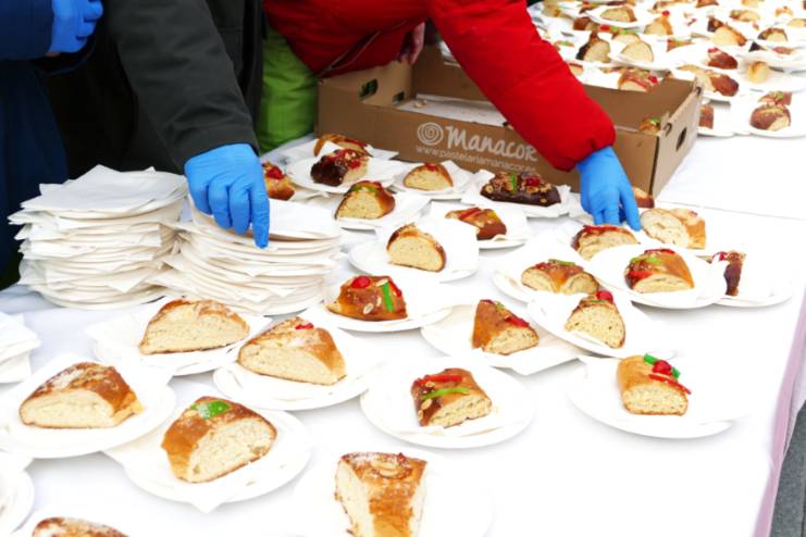 Imagen en alta resolución. Este enlace se abrirá mediante lightbox, puede haber un cambio de contextoLa alcaldesa de Móstoles, Noelia Posse, junto a varias concejalas y concejales de la Junta de Gobierno Local ha asistido a la degustación del roscón solidario que el Ayuntamiento ha organizado esta mañana en la Plaza de España, y que ha contado con la asistencia de numerosos vecinos y vecinas que han querido participar en la iniciativa. El roscón ha sido elaborado por los alumnos y alumnas de Grado Medio del Ciclo de Pastelería, Panadería y Confitería de la Escuela de Hostelería y Turismo Simone Ortega. Los alumnos de FP Básica se han encargado del servicio durante el acto.