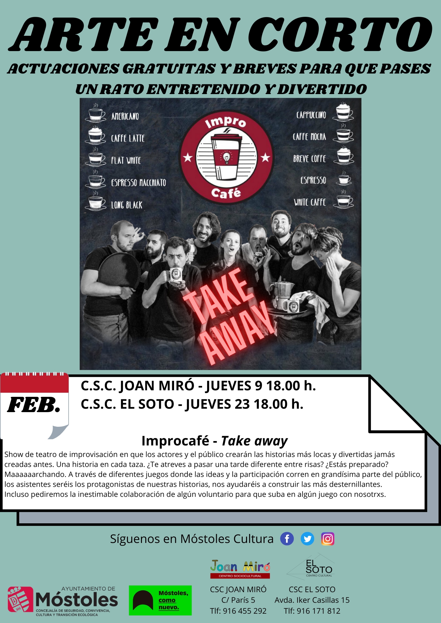 El jueves 23 a las 18:00 h, en el Centro Sociocultural El Soto, tendrá lugar una nueva sesión de "Arte en Corto" con el espectáculo de improvisación infantil "Take Away" por la Asociación Improcafé.