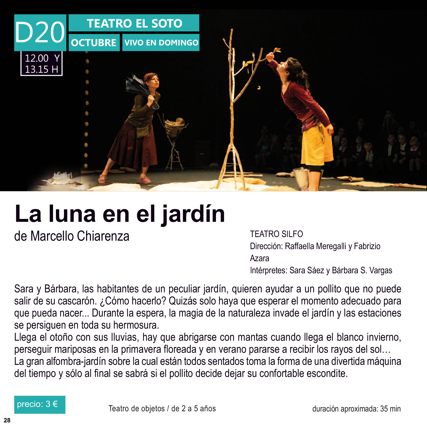 El sábado 19 de octubre llegará "La Lechuga", en el Teatro del Bosque a las 20 horas y el domingo 20 el espectáculo de teatro familiar "La luna en el jardín" a las 12 y a las 13,15 horas en el Teatro El Soto, dentro de la programación de `Vivo en Domingo´.