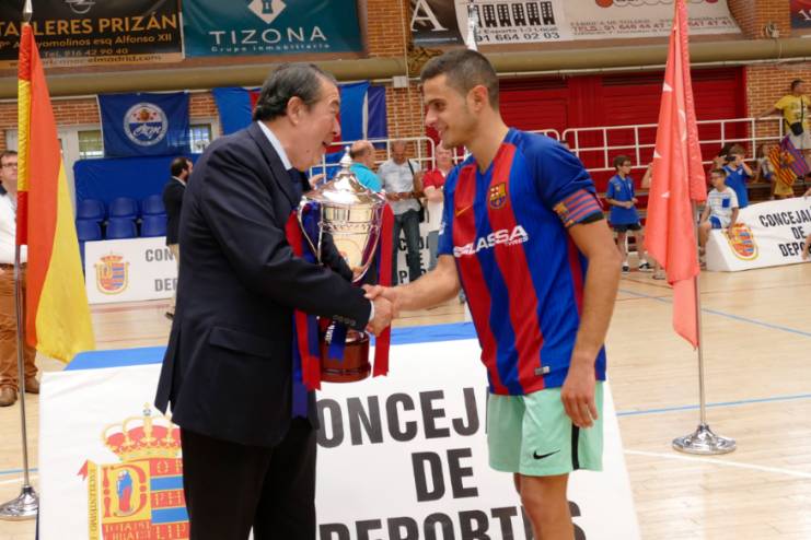 Imagen en alta resolución. Este enlace se abrirá mediante lightbox, puede haber un cambio de contextoEl concejal de Deportes, Agustín Martin, asistió este domingo 4 de junio al encuentro y entrega de trofeos de la final de la XIV Copa de España Juvenil de Fútbol Sala, disputado entre El Pozo Murcia y FC Barcelona Lassa. El partido se celebró en el pabellón municipal de Villafontana y terminó con un resultado de (1-2) a favor del FC Barcelona quien se proclamó campeón de España.