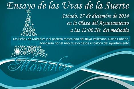 Ensayo uvas de la SuerteImagen en alta resolución. Este enlace se abrirá mediante lightbox, puede haber un cambio de contextoEnsayo uvas de la Suerte Una de las principales novedades de las Fiestas Navideñas de este año será la iniciativa que llevarán a cabo la Federación de Peñas de Móstoles el próximo 27 de diciembre las 12.00 horas en la Plaza España con el ensayo de las uvas de la suerte.