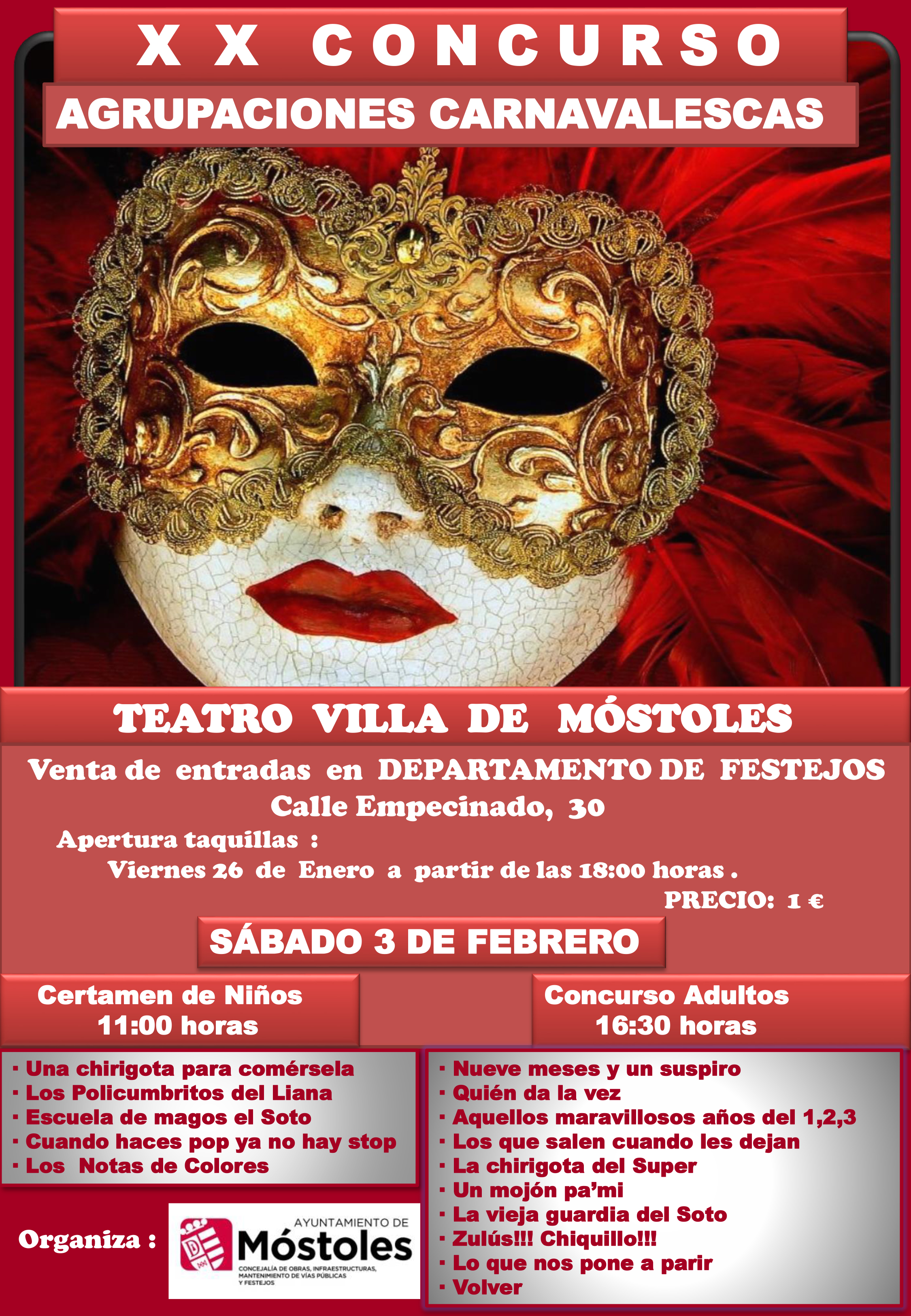 A partir de las 16.30 horas comenzará la XX edición de adultos del `Concurso de Agrupaciones Carnavalescas´ de Móstoles con 10 peñas participantes, que harán reír con sus letras ingeniosas y llenas de humor. Gracias a las peñas El Churri, Los Mixtos, Las Cumbres, Barbacana, Los Independientes, Lugareños 2008, El Soto, Los Corbatos, El Soniquete y La Era, se trata de un concurso que cuenta con un gran arraigo en la ciudad y fuera de ella.