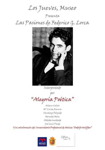 Imagen en alta resolución. Este enlace se abrirá mediante lightbox, puede haber un cambio de contextoLa programación cultural de "Los Jueves, Museo" presentará, el próximo jueves 15 de octubre , a las 18:30 h. en el Museo de la Ciudad el recital "Las Pasiones de Federico G. Lorca", interpretado por el grupo "Alegoría Poética".