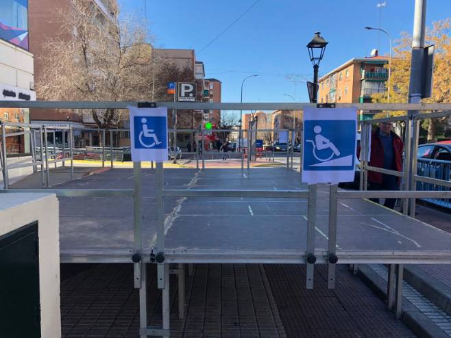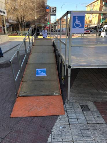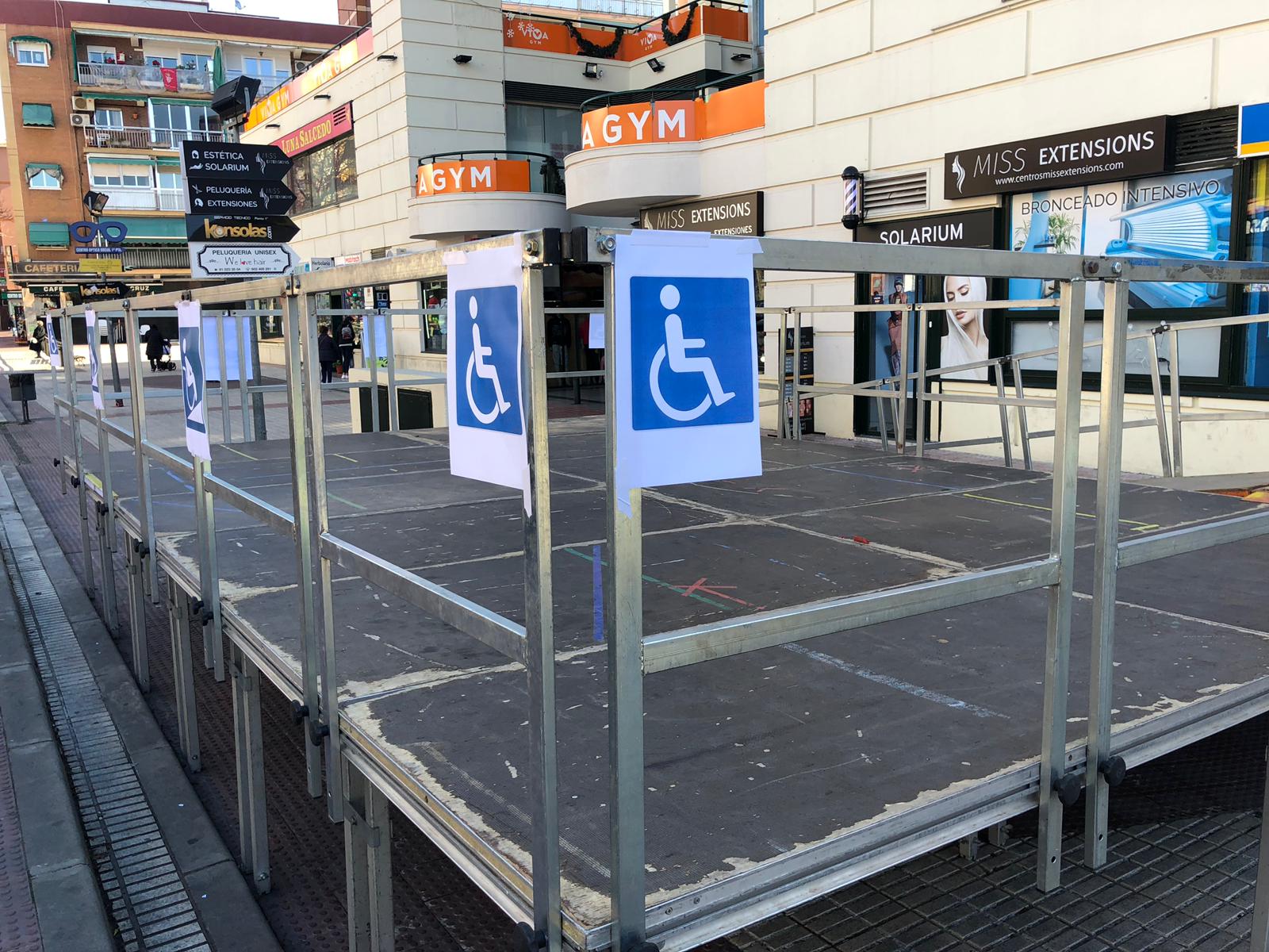 El diseño del recorrido incluye la instalación, en la Avda. Dos de Mayo, a la altura del número 27, en la puerta del Centro Comercial, de una plataforma elevada de 24 m2, con acceso por rampa, y acotada para discapacitados motóricos y diversidad funcional.