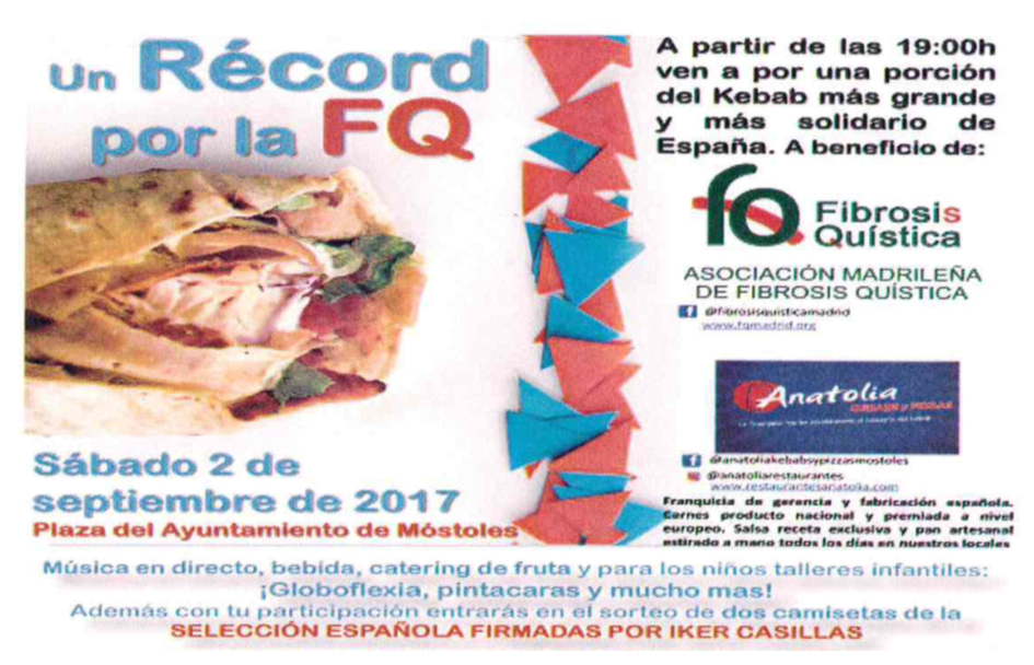 Se organizarán diferentes actividades en la calle, tales como música en directo, talleres infantiles de globoflexia y pintacaras, entre otros. A partir de las 19:00 horas, los asistentes podrán colaborar mediante la degustación de una porción de un `kebab´ que se pretende sea el más grande y solidario de España. La recaudación irá destinada a la Asociación Madrileña de Fibrosis Quística. Asimismo, los participantes tendrán acceso a un sorteo de dos camisetas de la selección española de fútbol firmadas por Iker Casillas.