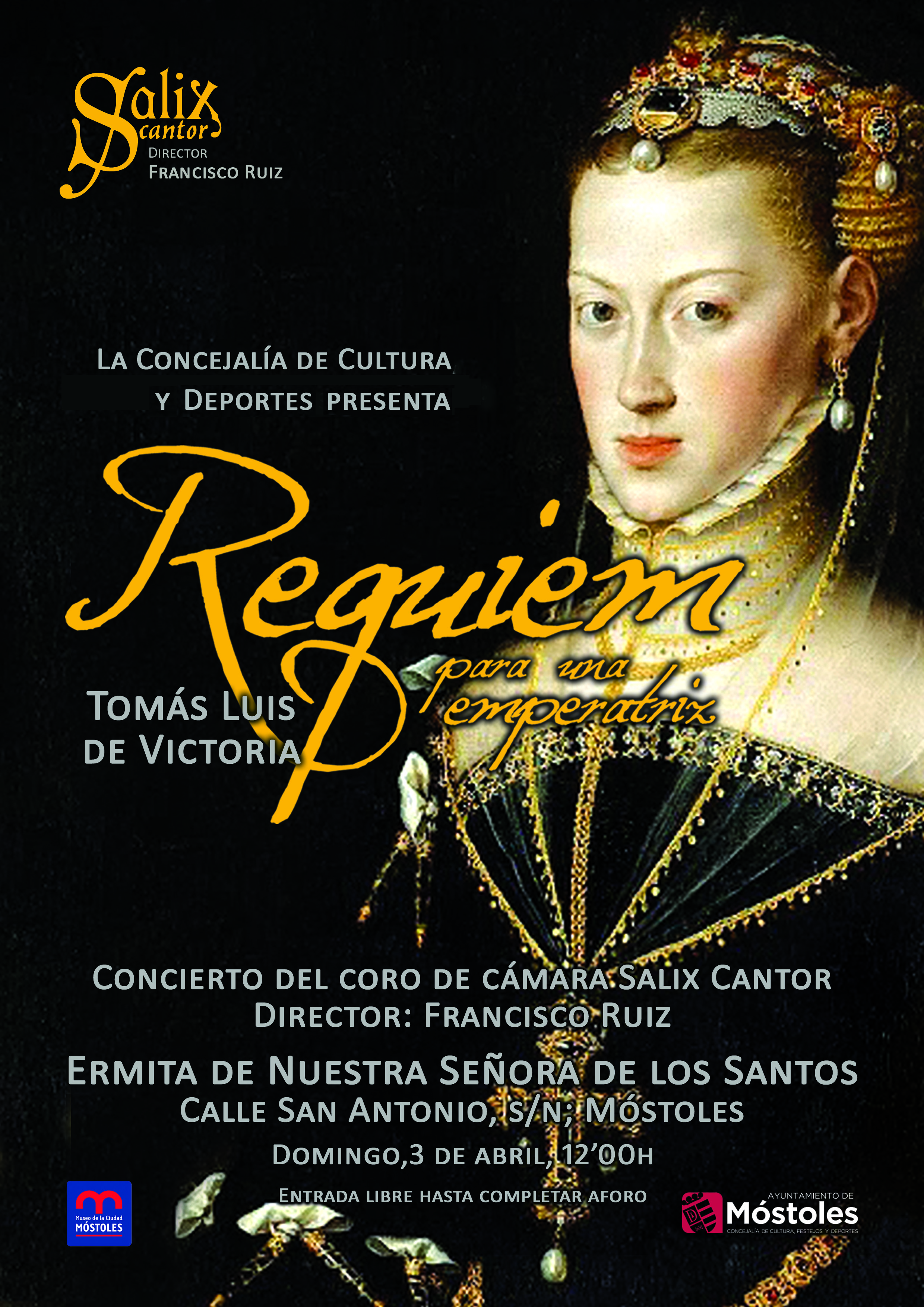 Imagen en alta resolución. Este enlace se abrirá mediante lightbox, puede haber un cambio de contextoLa concejalía de Cultura y Deportes presenta el domingo 3 de abril, a las 12 horas en la Ermita de Nuestra Sra. de los Santos el concierto "Requiem para una emperatriz", interpretado por el grupo vocal "Salix Cantor",bajo la dirección de Francisco Ruíz.. Las entradas se podrán retirar a partir del martes 29 de marzo en el Museo de la Ciudad, en el horario habitual del mismo.