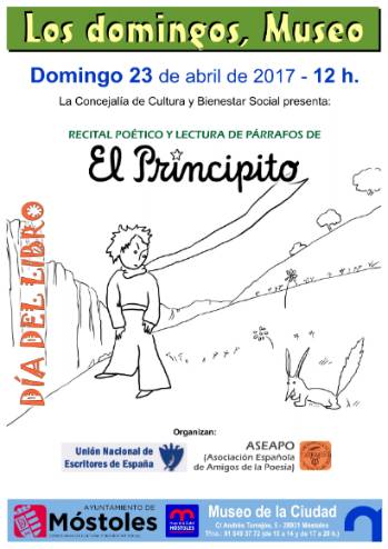 La Asociación Española de Amigos de la Poesía (ASEAPO) y la Unión de Escritores de España (UNEE) ofrecerán, a las 12 horas, en el Museo de la Ciudad, un recital poético basado en párrafos del libro de "El Principito" de Antoine de Saint-Exupéry, con motivo del Día Internacional del L:ibro.
