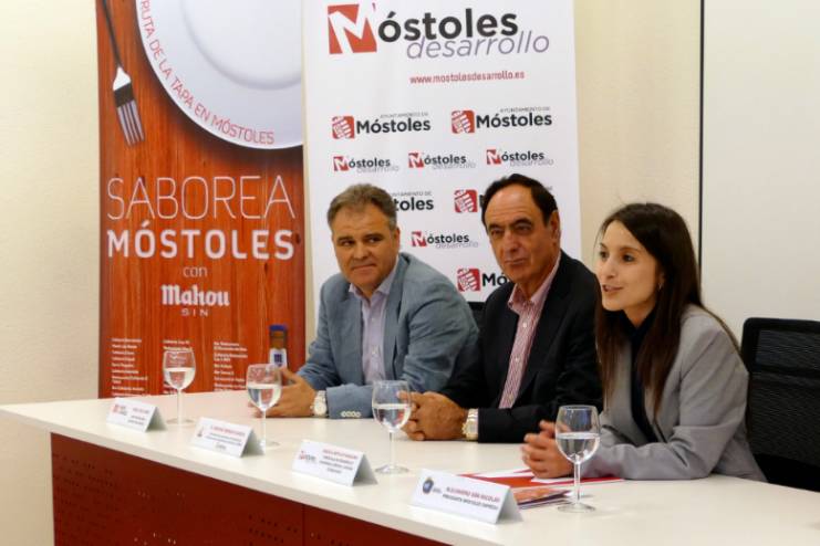 Imagen en alta resolución. Este enlace se abrirá mediante lightbox, puede haber un cambio de contextoLa concejala de Desarrollo Económico, Empleo y Nuevas Tecnologías, Jessica Antolín, junto al presidente y el secretario de AEPIM, Arsenio Moreno y Luis del Castillo, el presidente de Móstoles Empresa, Alejandro San Nicolás, representantes de Mahou San Miguel, y a algunos hosteleros participantes, presentó esta mañana la IX Ruta de la Tapa en Móstoles, bajo el nombre de "Saborea Móstoles".