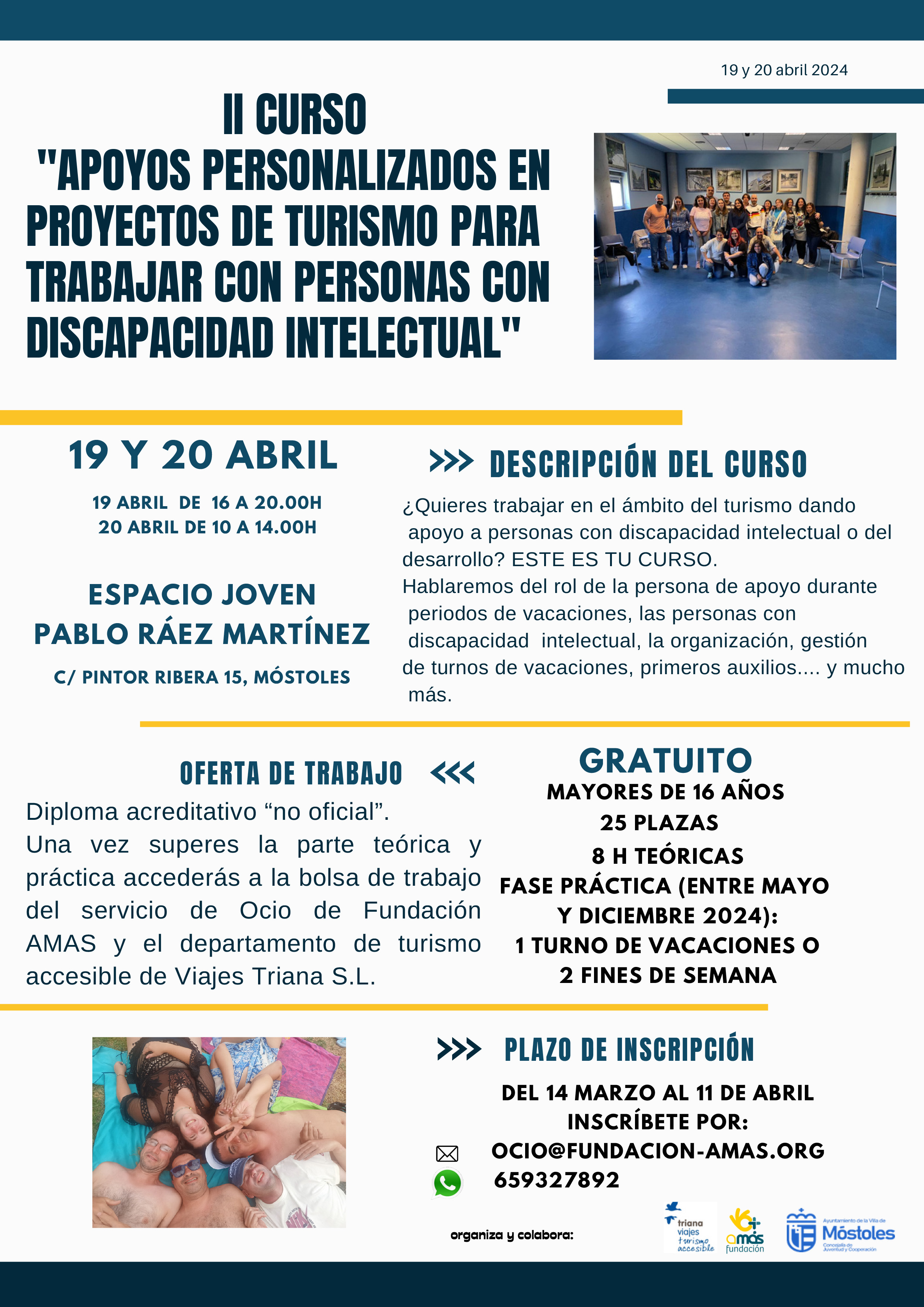 Está dirigido a mayores de 16 años, dispone de 25 plazas y consta de 8 horas teóricas y una fase práctica que se llevará a cabo entre mayo y diciembre. Una vez concluido este período, habiendo superado la fase teórica y la práctica, se podrá acceder a la bolsa de trabajo del Servicio de Ocio de la Fundación AMÁS y del departamento de Turismo Accesible de Viajes Triana.