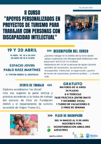 • El curso, organizado por la Concejalía de Juventud y Cooperación del Ayuntamiento de Móstoles, el Servicio de Ocio de la Fundación AMÁS y Viajes Triana Turismo Accesible, ofrece formación para trabajar en el ámbito del turismo dando apoyo a personas con discapacidad intelectual o del desarrollo.