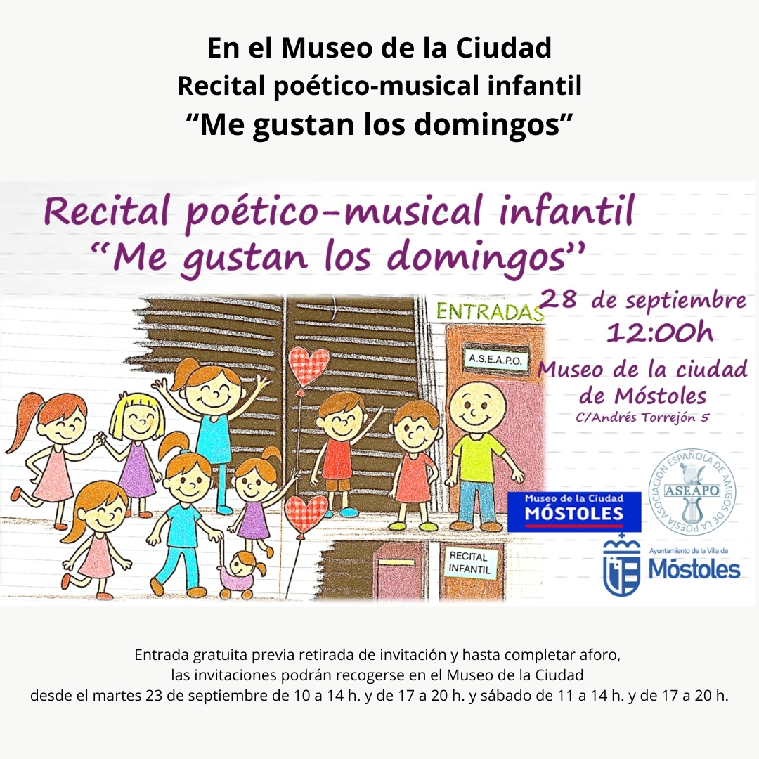 El domingo 28, a las 12:00 h, el Museo de la Ciudad acogerá el recital poético-musical infantil a cargo de ASEAPO, "Me gustan los domingos". Se puede asistir, de manera gratuita, previa retirada de invitaciones en el propio centro.
