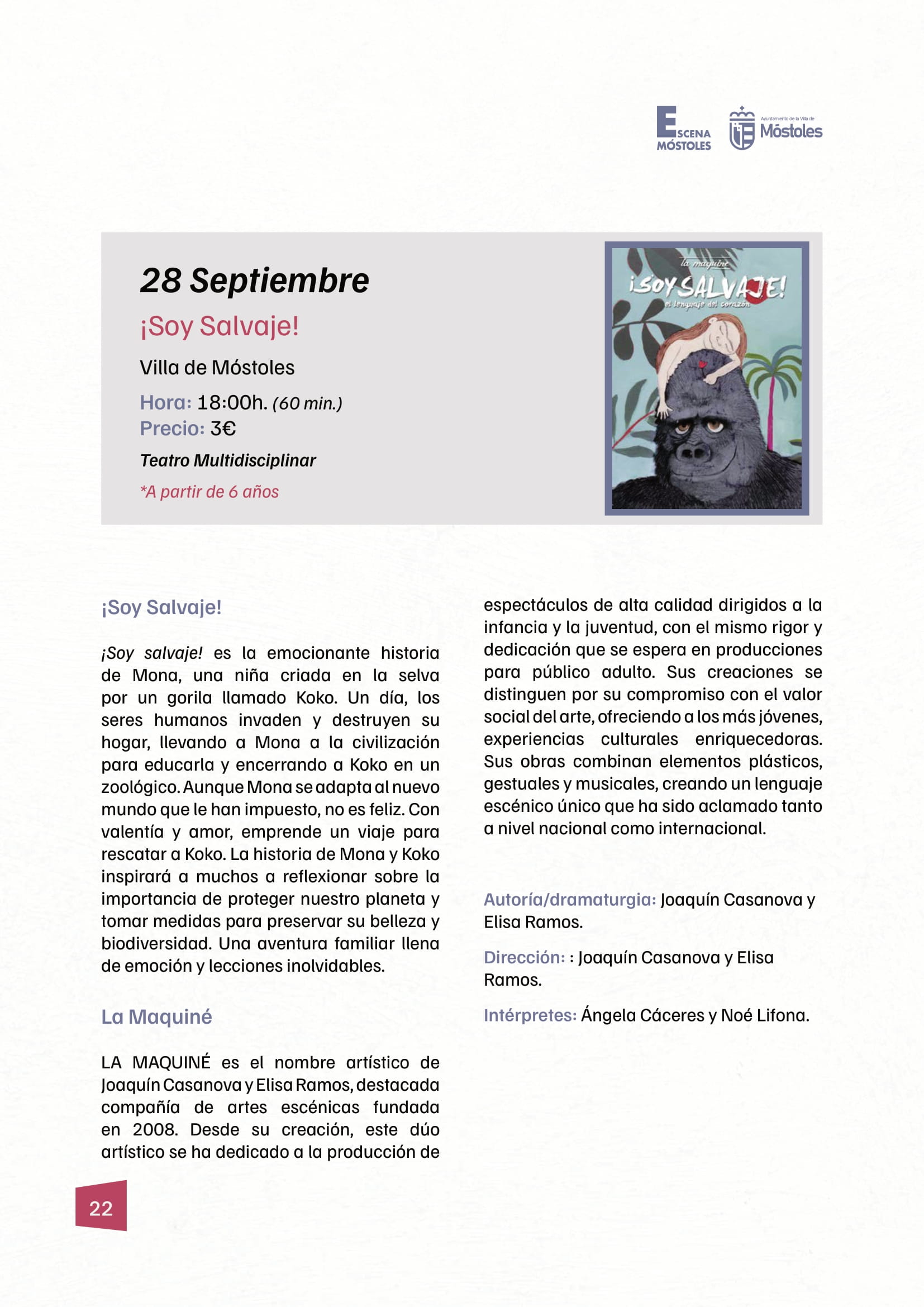 Para la tarde dominical,el Teatro Villa de Móstoles ofrece, a las 18:00 h, la puesta en escena "¡Soy salvaje!", teatro multidisciplinar familiar a cargo de la compañía La Maquiné, con la historia de Mona, una niña criada en la selva por un gorila llamado Koko. Una aventura familiar llena de emoción y lecciones inolvidables.