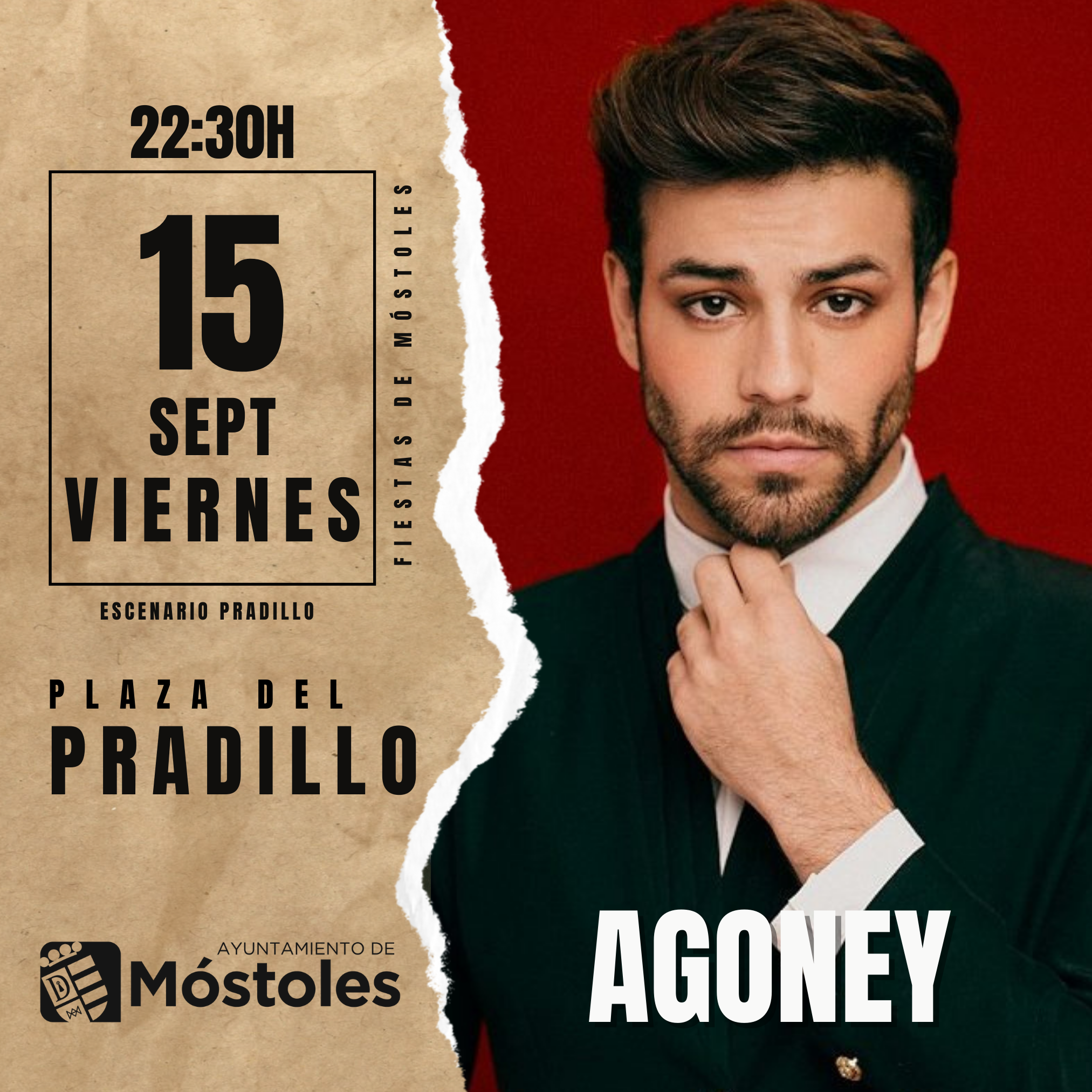 Cartel AGONEYCartel AGONEYAgoney formará parte de las Fiestas Patronales de Móstoles 2023. Será el viernes 15 septiembre a partir de las 22:30 horas en la Plaza del Pradillo cuando el artista canario ofrecerá un concierto gratuito.