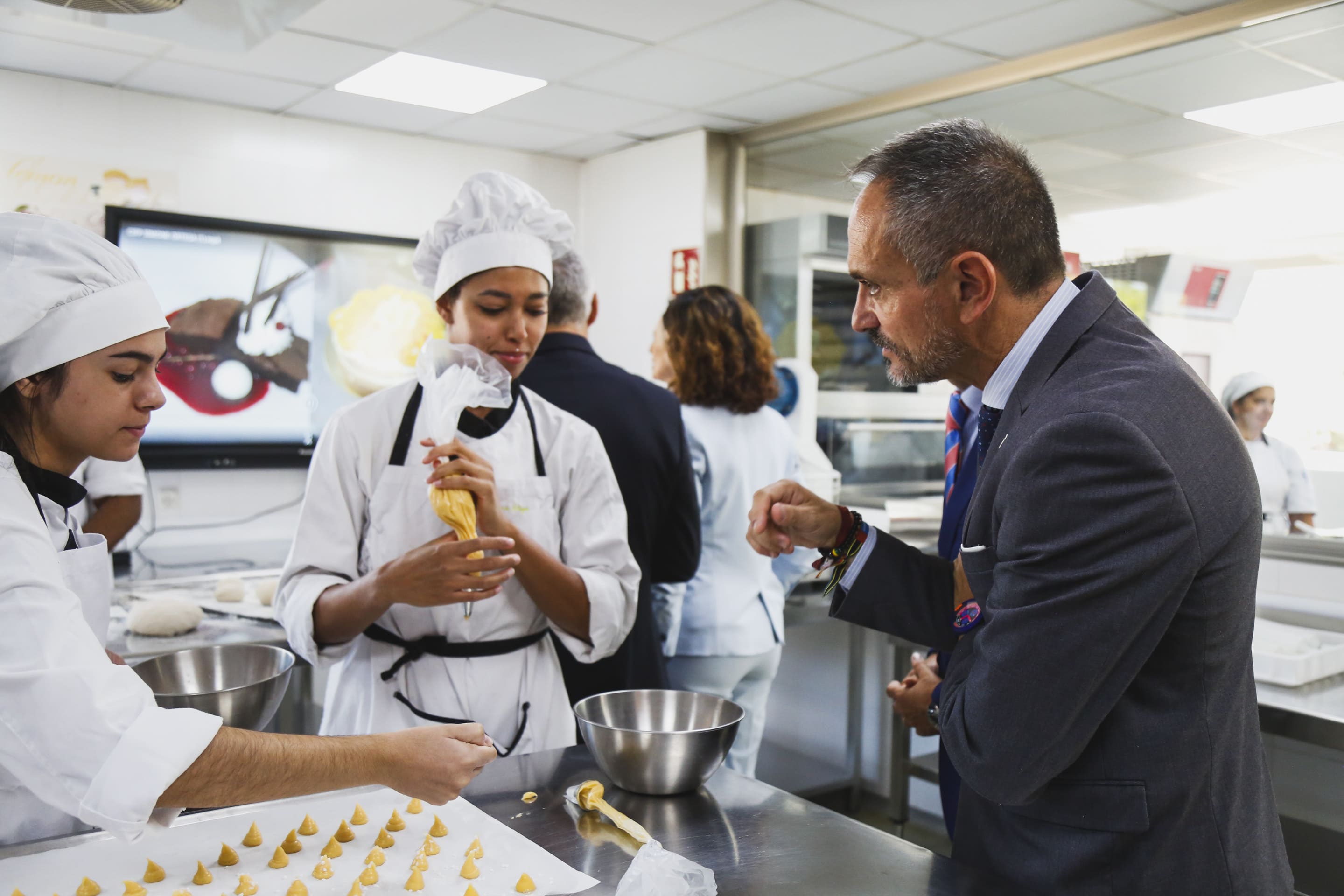 Allí, han realizado un recorrido por las instalaciones del centro educativo visitando el área de servicio de comida para llevar "Simone&Go", y las aulas de Guías de Turismo, de alojamiento y lavandería, de Emprendimiento y Barista y al aula de Tecnología Aplicada (ATECA), a las que asisten alumnos de 2º curso de grado superior. También, han visitado el aula restaurante Cafetería Sweet, con alumnos de 2º grado básico de FP; el aula Cocina y Restaurante Manuela Malasaña; el aula Obrador y el aula de cocina Andrés Torrejón, de grado medio.
