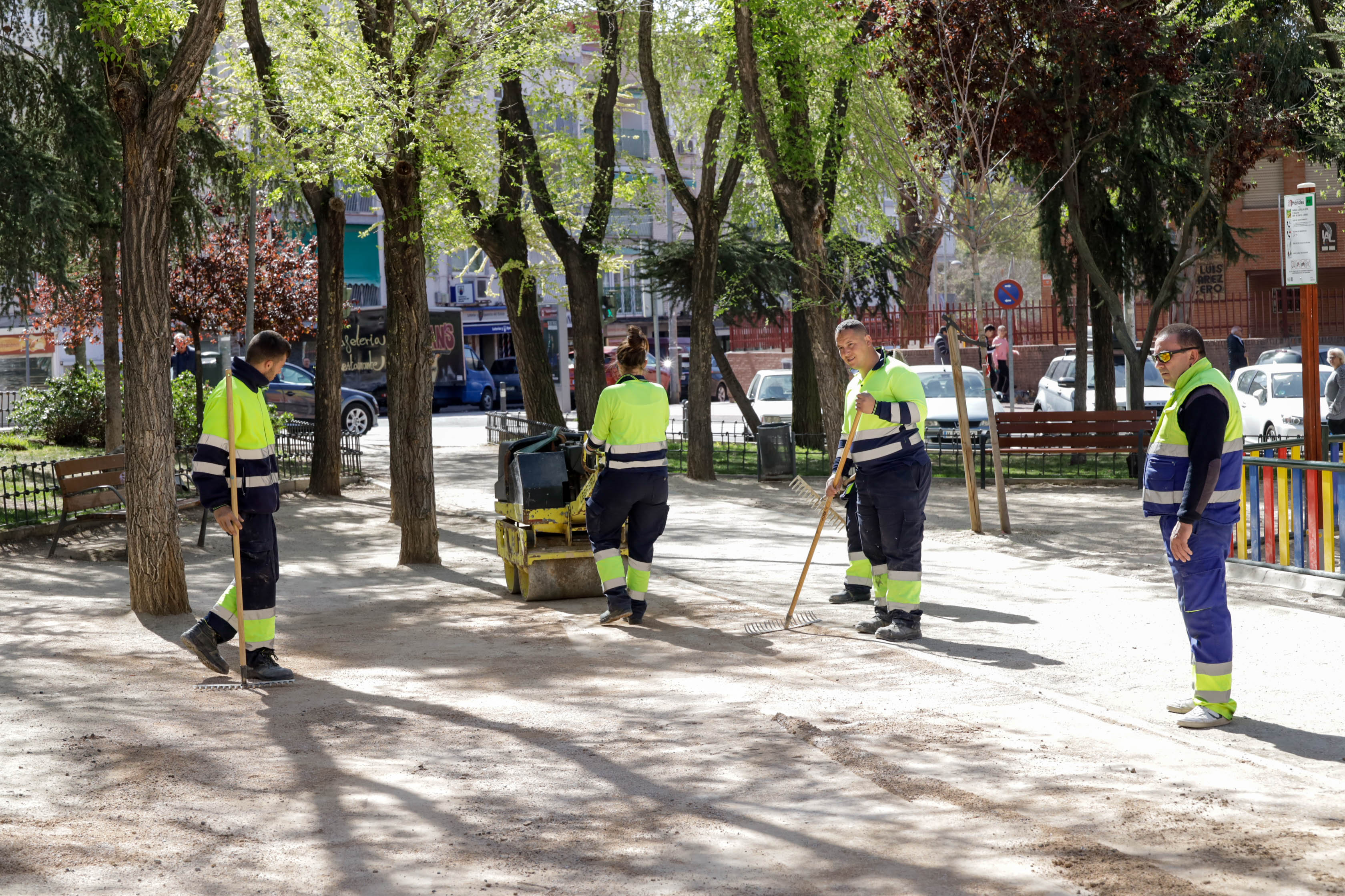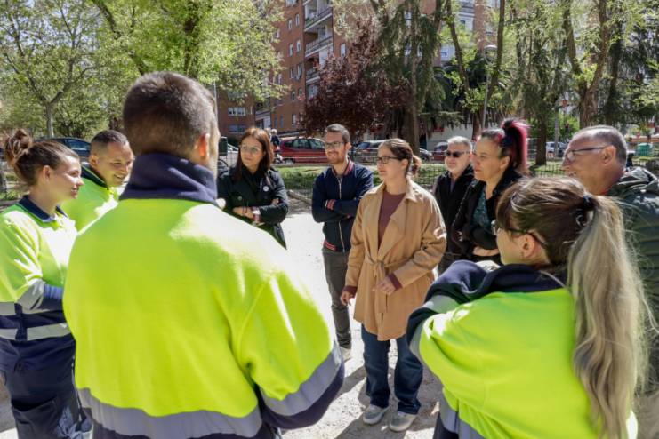 La Alcaldesa de Móstoles, Noelia Posse, acompañada de la Concejala de Empleo y Nuevas Tecnologías, el Concejal de Mejora y Mantenimiento de los Espacios Públicos, David Muñoz y la Portavoz de Podemos, Mónica Monterreal, ha visitado hoy a los peones de jardinería en el parque de Castilla-La Mancha.