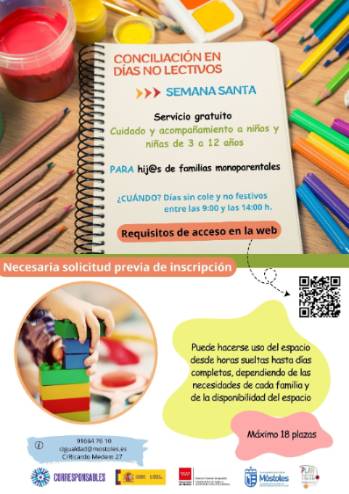 - La oferta del Ayuntamiento de Móstoles para fomentar la conciliación de las familias mostoleñas durante los días no lectivos de Semana Santa incorpora un servicio dirigido a familias monoparentales y familias atendidas por los recursos competentes del Área de Igualdad, además de las colonias urbanas "Conciliamós Mini-vacaciones Semana Santa 2025" y los talleres culturales Días Sin Cole.