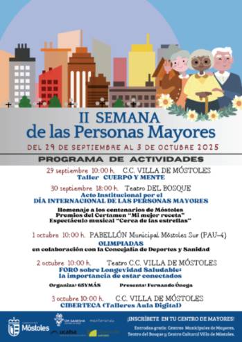 - Móstoles celebrará, del 29 de septiembre al 3 de octubre, la II Semana de las Personas Mayores, con la organización de diversas actividades, enmarcadas en el Día Internacional de las Personas Mayores, que se conmemora el 1 de octubre.
