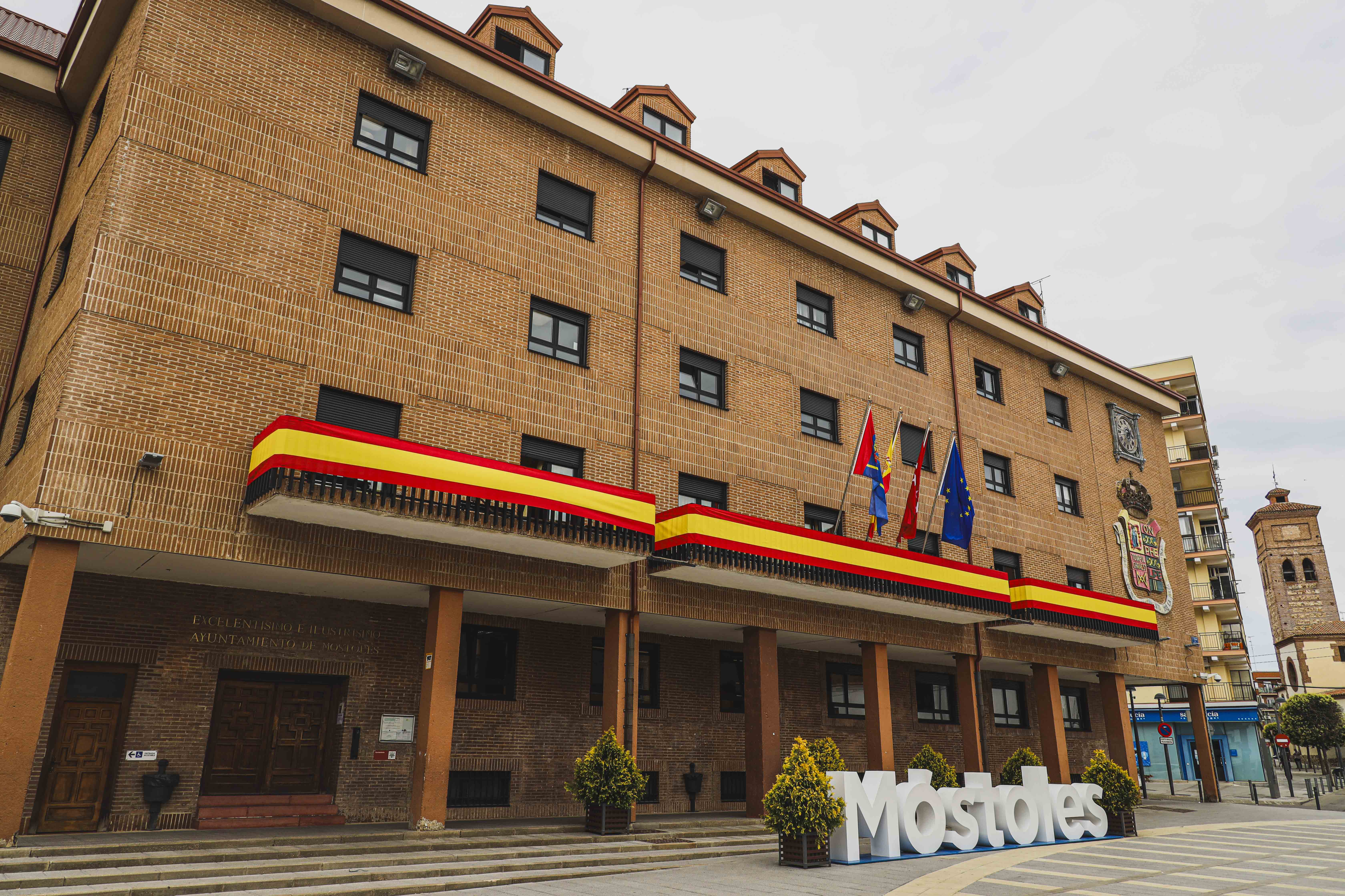 - El balcón de la Casa Consistorial se ha engalanado con la bandera de España mostrando el apoyo institucional que desde el Ayuntamiento de Móstoles se hace a la monarquía parlamentaria, de la que el máximo exponente es el rey.