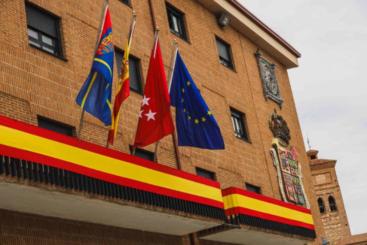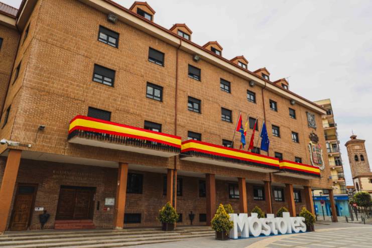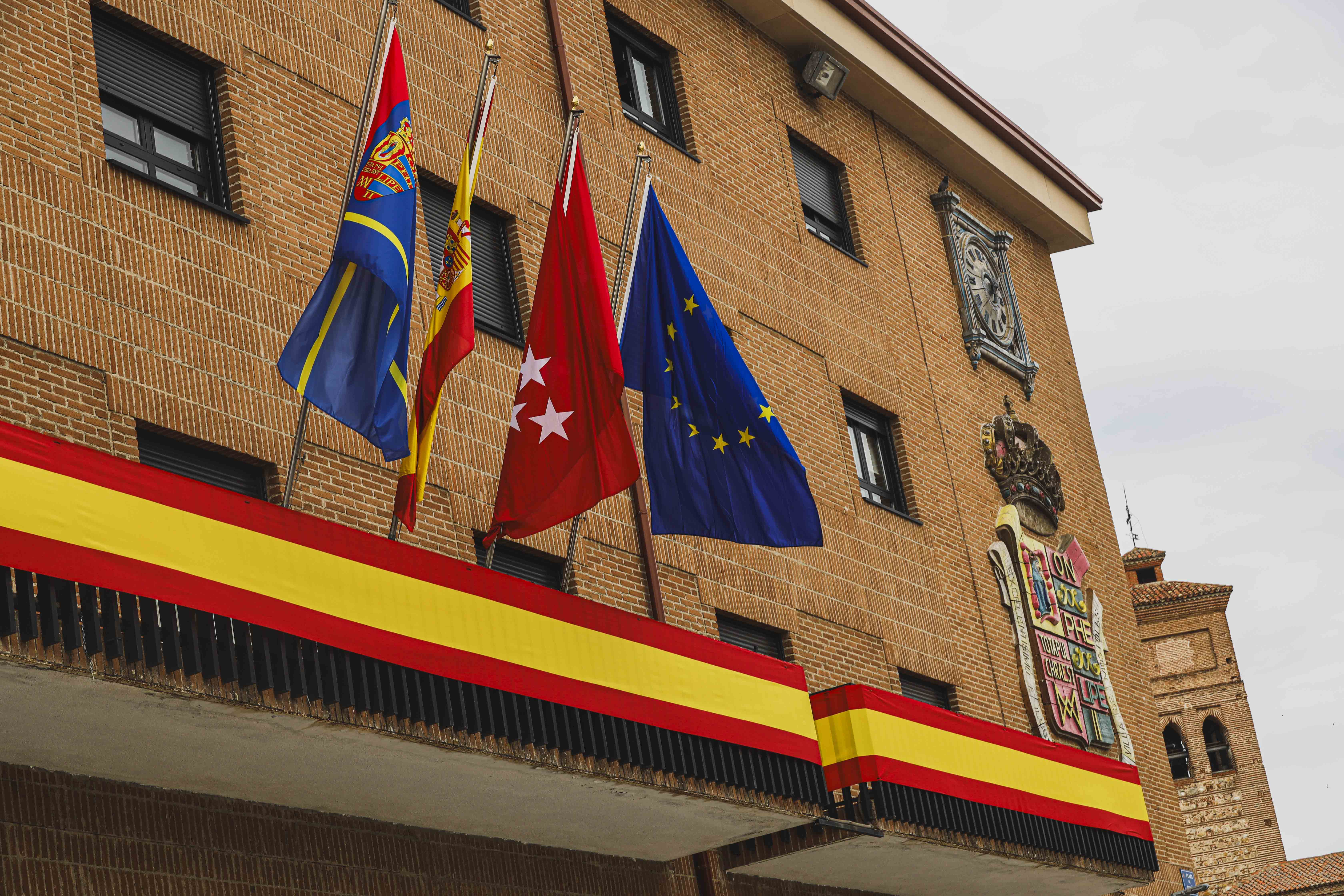 Con este acto, el Ayuntamiento de Móstoles se viste de gala y se une a la petición de la Consejería de Presidencia, Justicia y Administración Local de la Comunidad de Madrid, que ha solicitado a los ayuntamientos el engalanamiento de las fachadas de sus sedes principales.