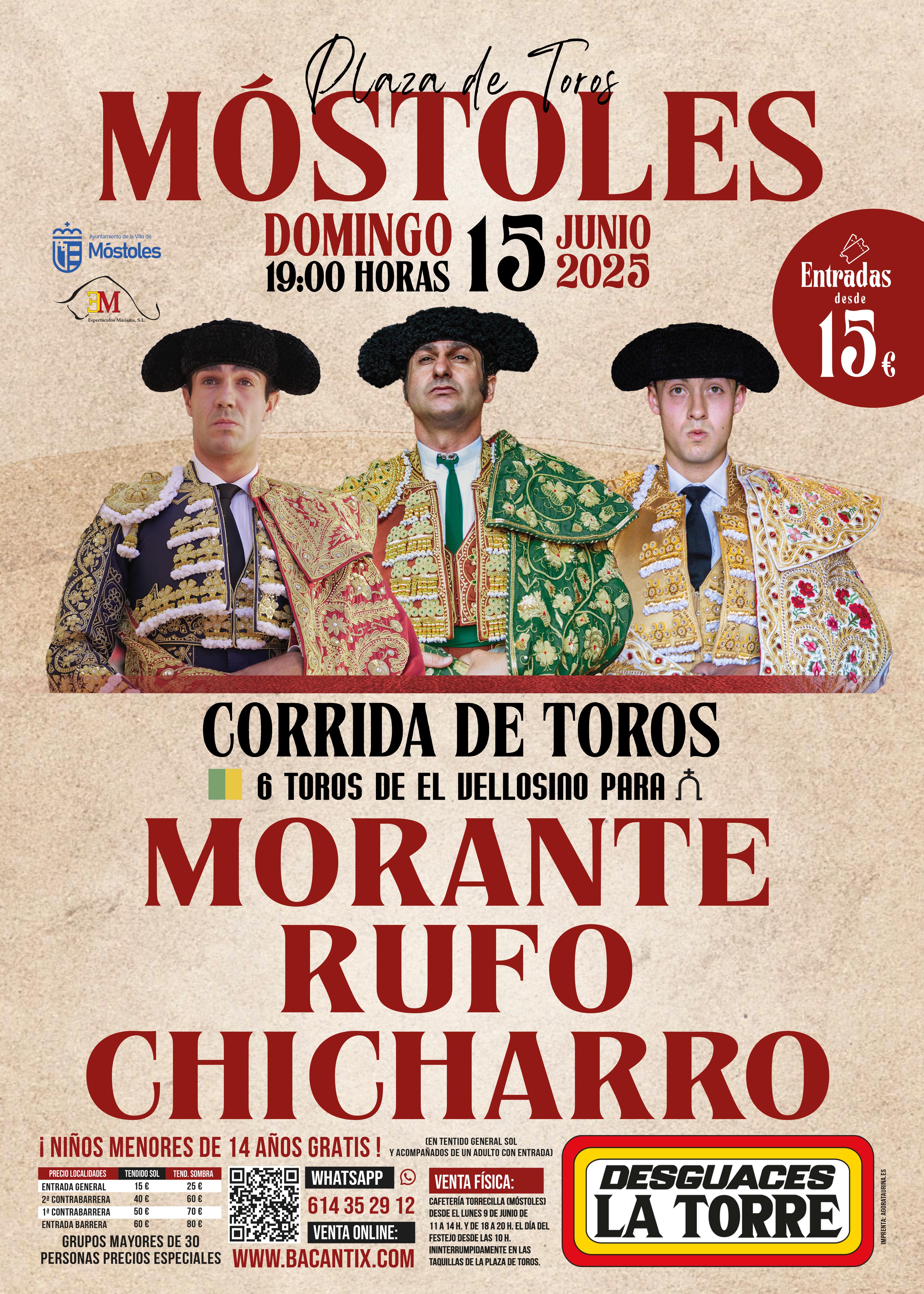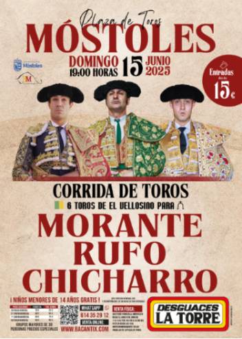 La corrida, organizada por el Ayuntamiento de Móstoles a través de la Concejalía de Educación y Festejos, será el domingo 15 de junio, a las 19:00 h, y se lidiarán seis astados de la ganadería de El Vellosino, conocida por la nobleza de sus toros.
