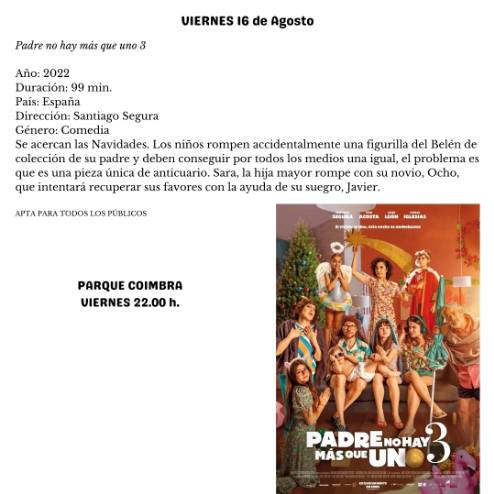 - Se proyectará la película "Padre no hay más que uno 3" el viernes 16, a las 22:00 h, en Parque Coimbra.