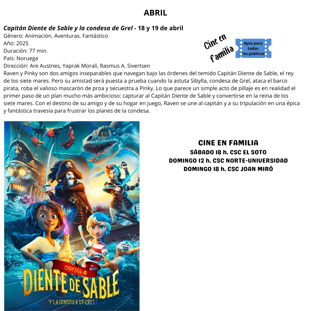 La programación de Cine en familia ofrecerá esta semana "Capitán Diente de Sable y la condesa de Grel", una divertida película de animación, para todos los públicos, protagonizada por dos amigos inseparables que navegan bajo las órdenes del temido Capitán Diente de Sable, el rey de los siete mares. Tras sufrir el barco un acto de sabotaje por la condesa de Grel la trama descubre su intención de ostentar ella ese título y los planes de los amigos por frustrar esas intenciones. La película se proyectará, de manera gratuita, el sábado, en el Centro Sociocultural El Soto, a las 18:00 h, y el domingo, a las 12:00 h en el Centro Sociocultural Norte-Universidad y a las 18:00 h, en el Centro Sociocultural Joan Miró. La retirada de invitaciones podrá hacerse desde el lunes en el propio centro, de 10:00 h a 14:00 h y de 17:00 a 20:00 h.