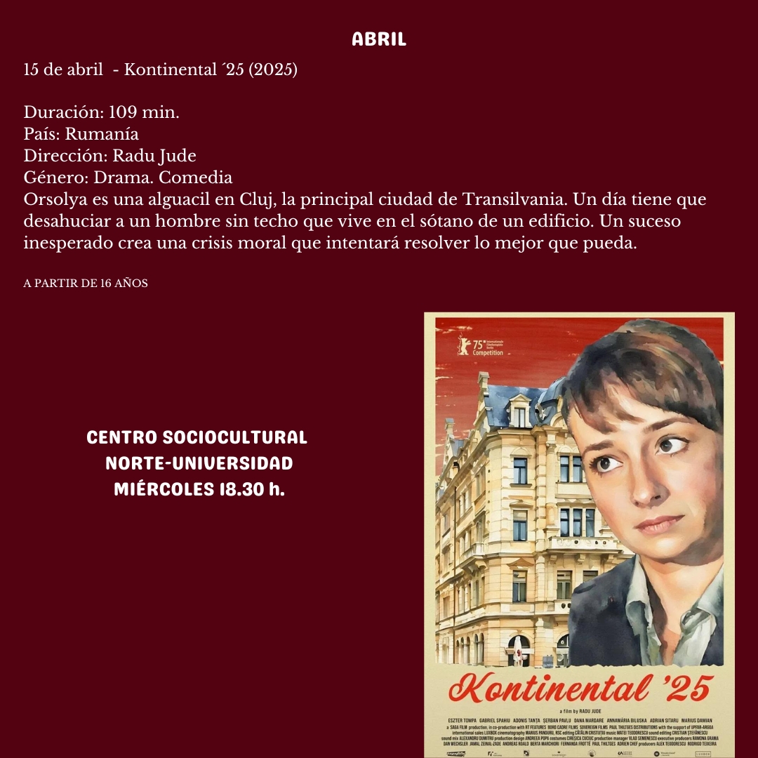 El ciclo de cine en versión original, Filmoteca, llega al este miércoles al Centro Sociocultural Norte-Universidad con la película "Kontinental ´25 (2025)", que comenzará a las 18:30 h. Este film de origen rumano, dirigida y escrita por Radu Jude, se desarrolla en Cluj, la principal ciudad de Transilvania, en clave de comedia negra con elementos de sátira política y drama. La entrada es gratuita, previa retirada de invitaciones en el propio centro.