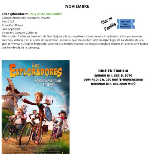Dentro de Cine en familia, la película de animación "Los exploradores" se proyectará de manera gratuita, el sábado 22 en el Centro Sociocultural El Soto, a las 18:00 h, y el domingo 23 en el Centro Sociocultural Norte-Universidad, a las 12:00 h, y en el Centro Sociocultural Joan Miró, a las 18:00 h. Las invitaciones se pueden retirar desde el lunes en el propio centro, de 10:00 h a 14:00 h y de 17:00 h a 20:00 h. Una película de aventuras que destaca el poder de la amistad y de soñar a lo grande.