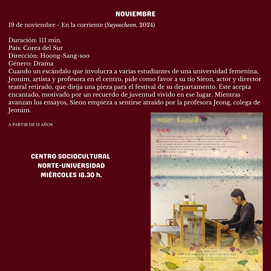 El miércoles 19, el ciclo Filmoteca acogerá la proyección de la película "En la corriente" (Suyoocheon, 2024), de Corea del Sur, dirigida por Hoong-Sang-soo, en el Centro Sociocultural Norte-Universidad, a las 18:30 h, con entrada gratuita previa retirada de invitaciones en el propio centro.