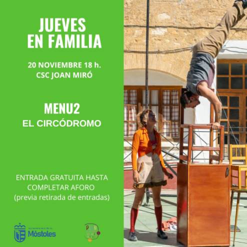 El jueves 20 continúa el espectáculo circense de la compañía El Circódromo, "Menu2", dentro de la programación de Jueves en Familia, que se llevará a cabo esta semana en el Centro Sociocultural Joan Miró, a las 18:00 h. La entrada es gratuita, previa retirada de invitaciones en el propio centro.