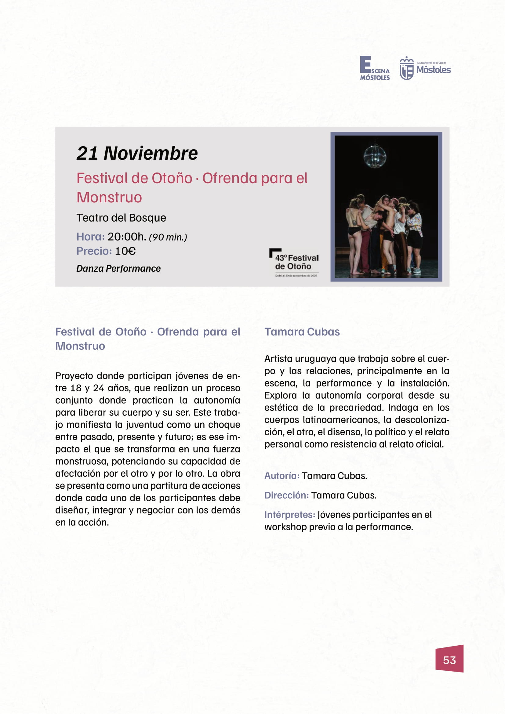 Y el 21, en el Teatro del Bosque, a las 20:00 h, se podrá disfrutar de una "Ofrenda para el monstruo", unadanza performance a cargo de la artista uruguaya Tamara Cubas, dentro del Festival de Otoño, protagonizada por jóvenes de entre 18 y 24 años. Este proyecto manifiesta la juventud como un choque entre pasado, presente y futuro y ese impacto se transforma en una fuerza monstruosa.