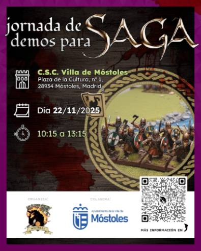 El 22, también en el Centro Cultural Villa de Móstoles se celebrará una "Jornada de demos para SAGA", de 10:15 h a 13:15 h, organizada por la Asociación cultural Los Últimos Jinetes, dedicada a juegos de rol, cartas, simulación, etc. Una experiencia para quienes comparten la pasión por la narrativa, la estrategia y la camaradería que ofrecen estos juegos.