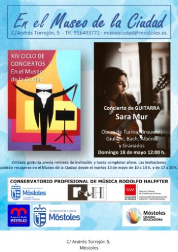La semana acaba con música. El domingo 18, se podrá disfrutar del "Concierto de guitarra", de Sara Mur, profesora del Conservatorio Profesional de Música Rodolfo Halffter, dentro del XIV Ciclo de Conciertos en el Museo de la Ciudad, a las 12:00 h. La entrada es gratuita, previa retirada de invitaciones en el museo.