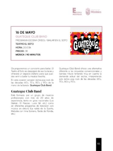 Por la tarde, se podrá disfrutar de un concierto para bailar de música pop rock de los 60, 70, 80 y 90, en el Teatro El Soto, a las 20:00 h, a cargo de "Guateque Club Band", integrada por un grupo de músicos profesionales con más de 20 años de experiencia.
