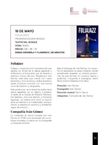 Por la tarde, a las 18:00 h, la Compañía Iván Gómez traerá al Teatro del Bosque el espectáculo de danza "Foliajazz", que fusiona la danza española y el flamenco con el mundo del jazz, mezclando tradición y vanguardia gracias a su enfoque innovador y creativo.