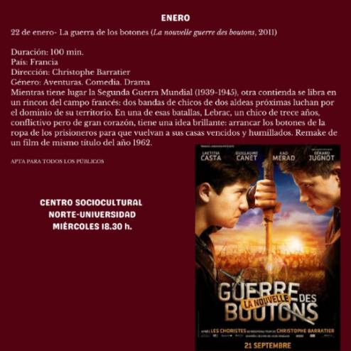 El cine tiene cabida en la programación de la agenda cultural en Móstoles con la proyección de la película "La guerra de los botones" (La nouvelle guerre des boutons, 2011), el miércoles 22, dentro del ciclo Filmoteca, en el Centro Sociocultural Norte-Universidad a las 18:30 h. La entrada es gratuita previa retirada de invitaciones en el propio centro.