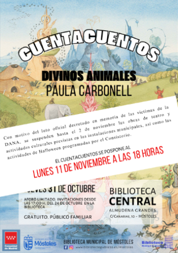 La agenda cultural, diseñada por el Ayuntamiento de Móstoles, a través de la Concejalía de Cultura, Desarrollo y Promoción Turística, arranca el lunes 11 con el cuentacuentos "Divinos animales". Paula Carbonell estará a las 18:00 h en la Biblioteca Central Almudena Grandes con historias protagonizadas por un perro, un tigre, un búho…