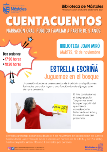 El martes 12 los niños a partir de tres años tienen una cita con el cuentacuentos "Juguemos en el bosque", a cargo de Estrella Escriñá, que se llevará a cabo en la Biblioteca Joan Miró a las 17:30 h y 18:30 h. Serán dos sesiones de 30 minutos.