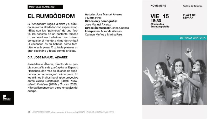 El fin de semana llega "Móstoles Flamenco", que se celebrará los días 15, 16 y 17 de noviembre. Dará comienzo el viernes 15 con el pregón inaugural en la Plaza de España a las 18:00 h, en el que cinco músicos liderados por Naike Ponce, destacada cantaora, ofrecerán un espectáculo de flamenco que rendirá homenaje a nuestras raíces. Acto seguido, a las 18:30 h, tendrá lugar "El Rumbódrom", interpretado por Miranda Alfonso, Carmen Muñoz y Marina Paje, bajo la dirección de Jose Manuel Álvarez y la dirección musical de Carlos Cuenca.