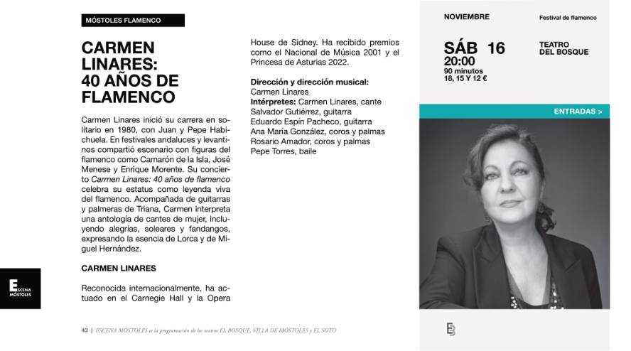 - El Festival "Móstoles Flamenco" se desarrollará los días 15, 16 y 17 con una amplia programación en la que destaca el concierto de Carmen Linares con el que celebra sus 40 años de flamenco.
