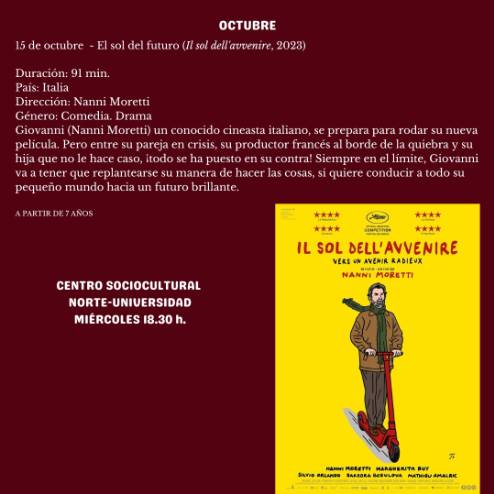 Dentro del ciclo Filmoteca, el día 15 también se podrá disfrutar de la película italiana "El sol del futuro" (Il sol dell'avvenire, 2023), en el Centro Sociocultural Norte-Universidad, a las 18:30 h, con entrada gratuita previa retirada de invitaciones en el propio centro.