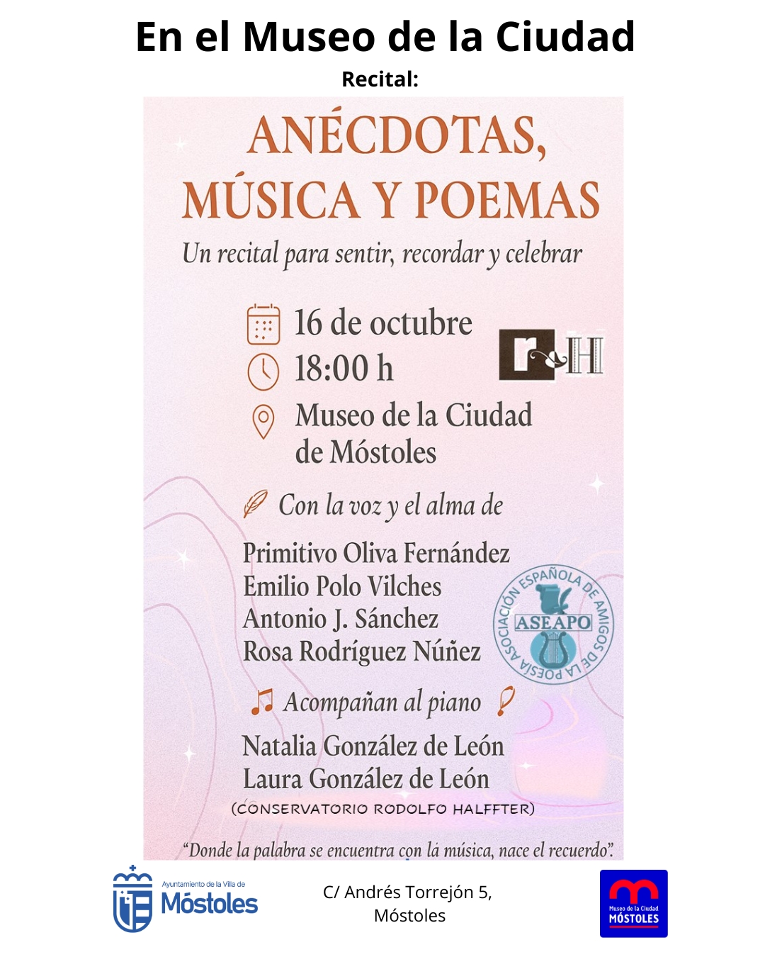 Y, también el jueves, en el Museo de la Ciudad se podrán escuchar "Anécdotas, Música y Poemas. Un recital para sentir, recordar y celebrar", un recital poético-musical a cargo de la Asociación Española de Amigos de la Poesía (ASEAPO), a las 18:00 h. Con la voz de Primitivo Oliva Fernández, Emilio Polo Vilches, Antonio J. Sánchez y Rosa Rodríguez Núñez, acompañados al piano por Natalia y Laura González de León, del Conservatorio Profesional de Música Rodolfo Halffter. Entrada gratuita previa retirada de invitaciones en el propio centro a partir del martes 14 de octubre.