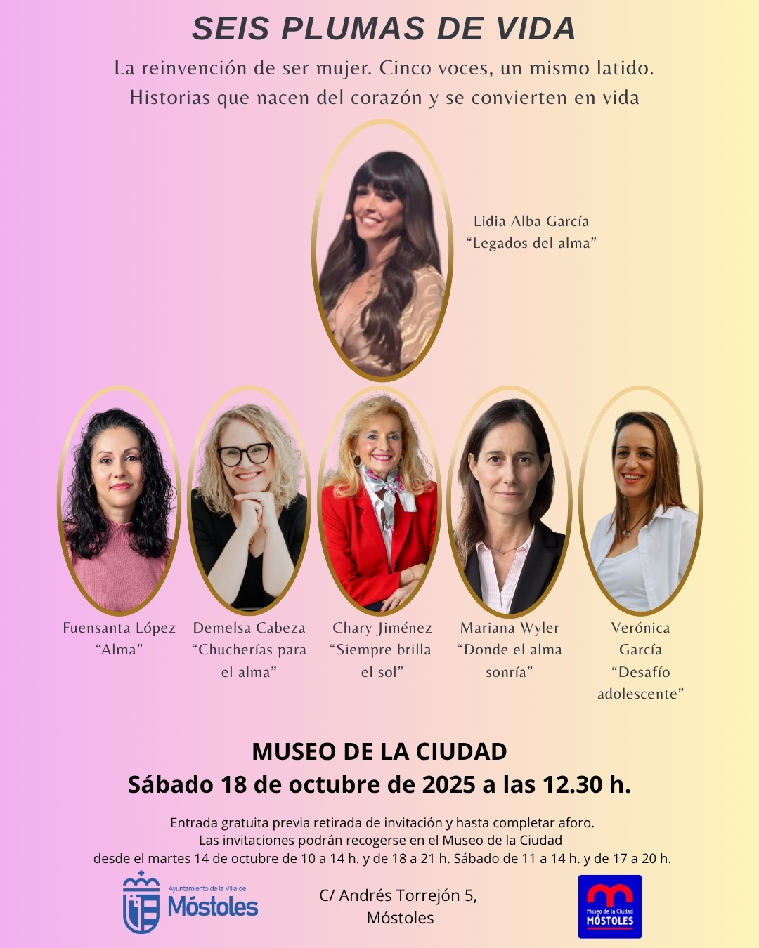 El sábado 18, el Museo de la Ciudad organiza un encuentro con seis escritoras, "Seis plumas de vida", con un denominador común: relatar historias que nacen del corazón y se convierten en vida, que presentarán sus libros, a las 12:30 h. El acto contará con la presencia de Lidia Alba García, que presentará sus "Legados del alma"; Fuensanta López, con "Alma"; Demelsa Cabeza, con "Chucherías para el alma"; Chary Jiménez, con "Siempre brilla el sol"; Mariana Wyle, con "Donde el alma sonría" y Verónica García, con "Desafío adolescente". La entrada es gratuita, previa retirada de invitaciones en el propio centro a partir del martes 14 de octubre.