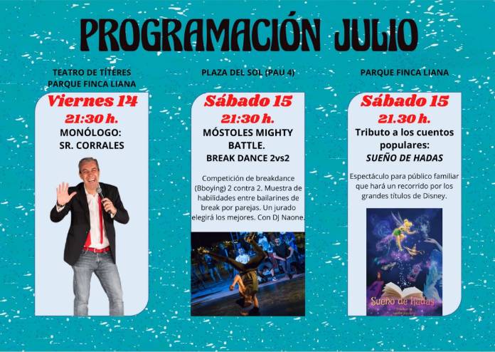 El fin de semana está protagonizado por la programación de Verano Flash. El viernes 14 el humorista Sr. Corrales llega, a las 21:30 h, al Teatro de Títeres del Parque Finca Liana con un monólogo cargado de humor de principio a fin.